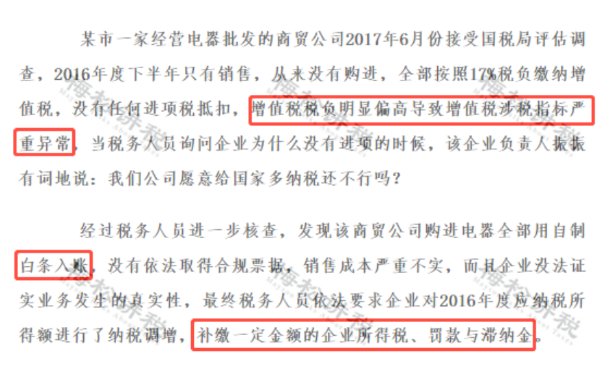 2、該企業(yè)采用自制的白條入賬,這些不合規(guī)的發(fā)票是不能在企業(yè)所得稅前扣除的,所以稅務機關讓企業(yè)進行應納稅所得額調整處理,補交企業(yè)所得稅。