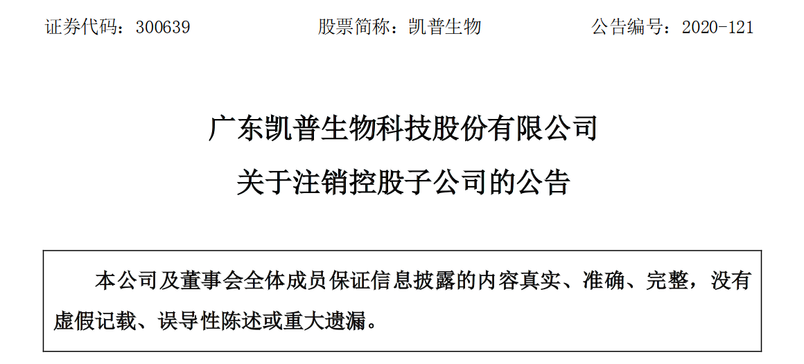 9月23日,凱普生物發(fā)布公告稱,公司于2020年9月23日審議通過《關(guān)于注銷控股子公司的議案》,同意注銷公司控股子公司紹興凱普醫(yī)學(xué)檢驗(yàn)所有限公司,并授權(quán)公司經(jīng)營(yíng)管理層負(fù)責(zé)辦理注銷、清算等相關(guān)事宜。