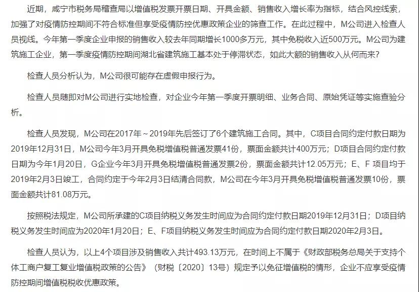 M建筑公司是一家注冊地在咸寧的企業(yè),近日,國稅局咸寧市稅務(wù)稽查局檢查人員約談了該公司負責人胡某(小伙伴們應(yīng)該最怕被約談了吧),在經(jīng)過一系列稽查工作后,胡某最終紙包不住火,承認通過將493.13萬元的施工收入在3月申報為當期免稅收入,試圖“渾水摸魚”利用疫情期間增值稅小規(guī)模納稅人階段性免稅政策,少繳稅款的事實。